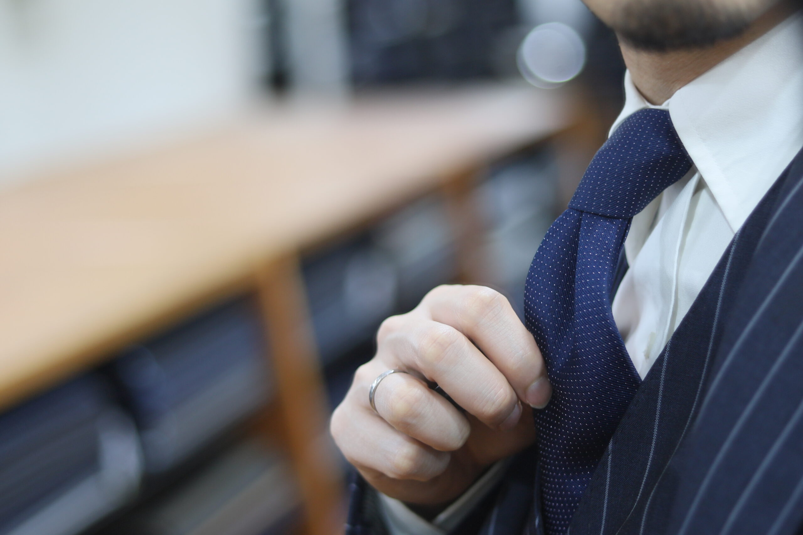 タイは元来よりまっすぐ下に垂らすものではなく